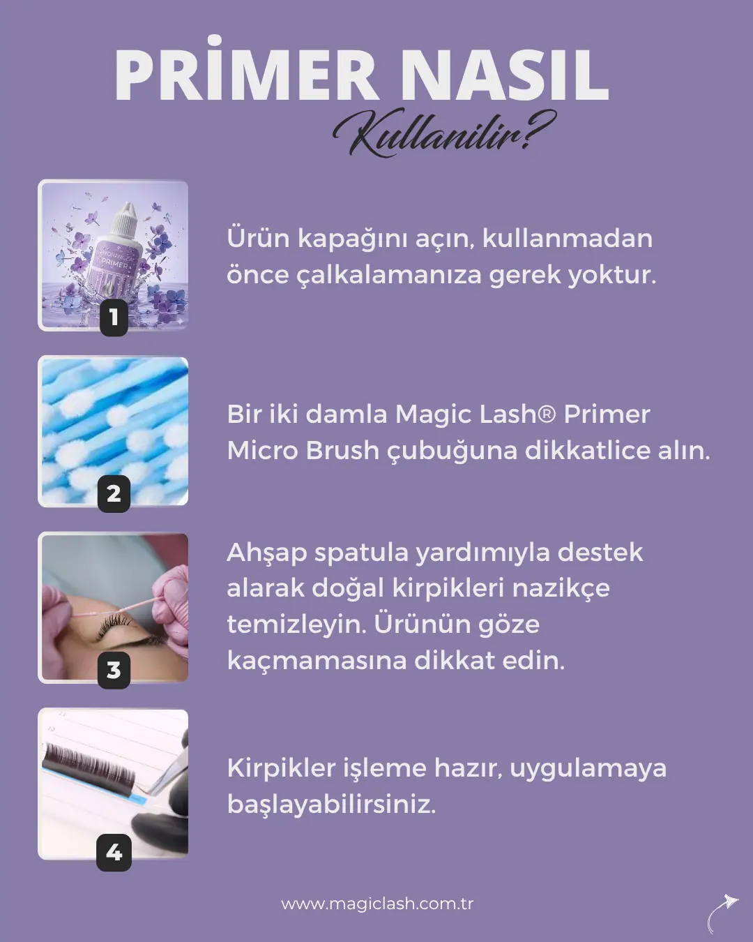 ⚠️ Uzman Notu: Primer’ı asla müşterinin göz kapağına veya derisine temas ettirmeyin. Sadece doğal kıl üzerine uygulanmalıdır.